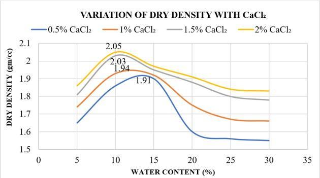 CompactionofsoilwithCaCl₂showedanincreasein drydensitywithdecreasingOMC