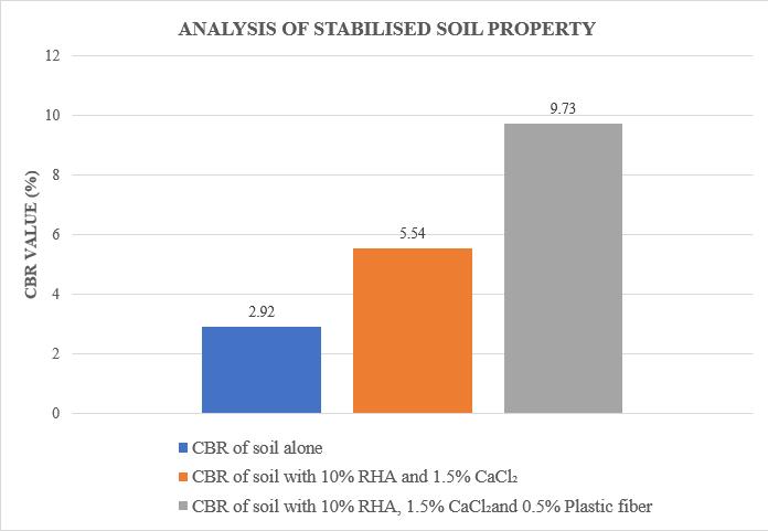 The CBRvalue of BlackCottonSoil increased after addition of 10%RHA + 1.5% CaCl₂ (5.54%) and 10%RHA + 1.5% CaCl₂ + 0.5% PlasticFiber(9.73%)ascomparedtountreated soil (2.92%). Good CBR value increases the stabilityofsoil.