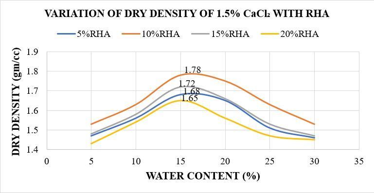 Theoptimumcombinationistakenas10%RHAwith 1.5% CaCl2 which has maximum dry density with minimumwatercontent.