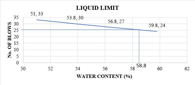 Theliquidlimitofthesoilisobtainedfromthegraph correspondingto25blowsas58.8%.Hencetheliquid limitofthesoilshigh.