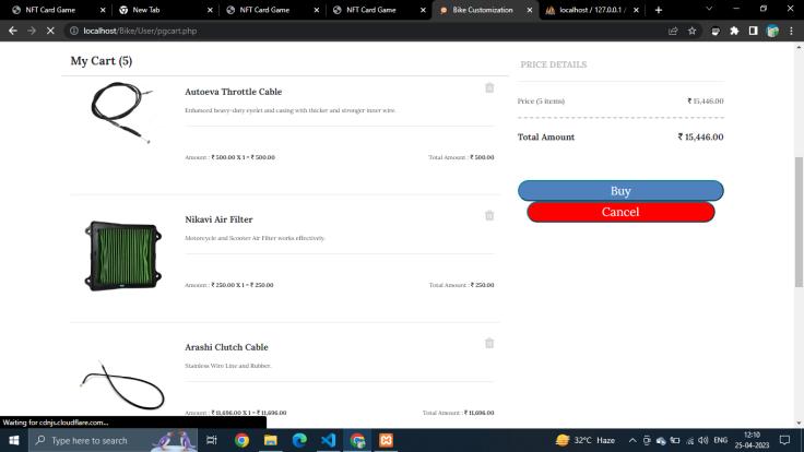 Theproposedapproachforthemotorcyclepartspurchase portal involves the integration of multiple technologies to provideanenhancedcustomerexperience.Firstly,userhas tologinusingtheuseridorgenerateanewone.Aftereach transactionontheusersside,dataiscollectedandanalyzed usingtheApriorialgorithmtogenerateitem-itemassociation rulesandmakepersonalizedcartrecommendations.There will be an option to log in for the admins to manage the website and prevent fraud. The catalogue will be editable directly through the interface and not dependent on the backend team for every minor update. Additionally, the portaloffersanoptiontobookpartfittingsoffline,allowing customerstoreceiveprofessionalinstallationservices.These orders will be approved or rejected by the vendors themselves through specialized login ids. Customers also have an option to book vendors to fit the parts they have purchased.Bybringingtogetherthesefeatures,theproposed approach aims to create a comprehensive solution for purchasingmotorcycle parts andaccessories,streamlining the process and providing a convenient platform for customersandvendorswhowillgetnewcustomers.