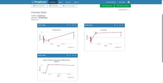 Thesystemsendsthedatathatiscollectedbythesensor totheIoTbasedplatformThingSpeak IoT whereall the previous data and current data is stored. This data is represented in the form of graph for each parameter as seen in the fig. which is further used for data-based analysis. The latest readings displayed on the Thing Speak IoT is then fetched in real time using thing speak API and these values are displayed on the mobile application as shown in the figure. The overall system helps the farmers/users in determining if the current conditions in the agricultural field for different produce is suitable or not without physically being there all the time which reduces labor effort and gives constant accurateresults.