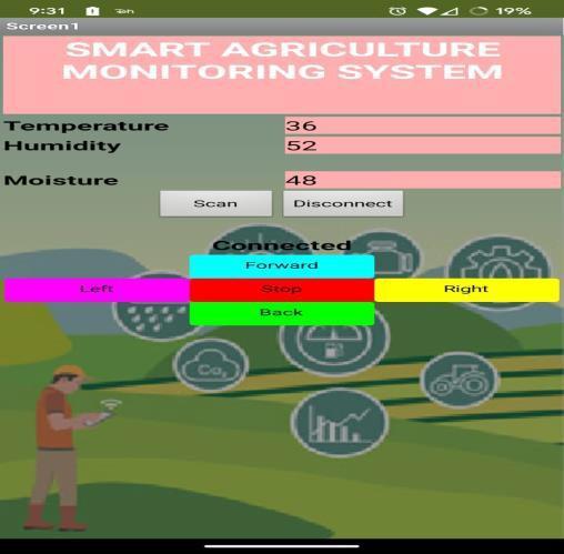application built to control this system enables to control the movements of robotic car and receive data from the sensorusedi.e.,Temperature,Humidity&Soilmoisture.[5]
