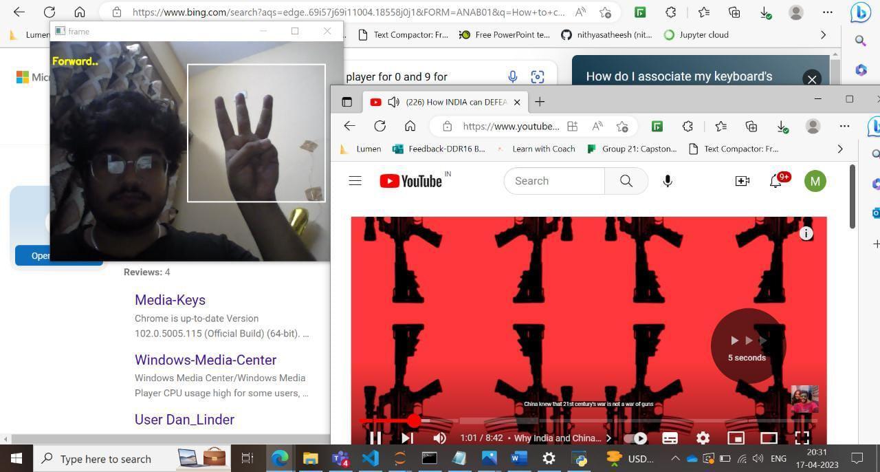We are using ‘pyautogui’ to integrate the labels with a particular media controlling function and then using the model trainedtopredictthegesturesandthusthelabelandproducingamediacontrollerfunctionattachedtoit.Hereweattach the functions such as ‘nothing’, ‘rewind’ and ‘Forward’ to the labels of data. Then after that it switches on the video feed andtakesinlivevideoinputsandfunctionsthemediafunctionsattachedtoittohandlethemediaplayer.