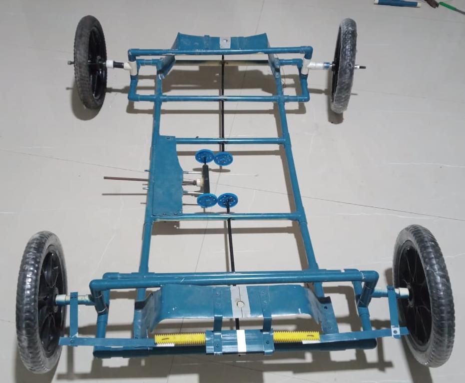 After finalization of our topic the first step we did was to collect information regarding our project on the internet then we did a group discussion through telephonic conversation and planned on how to execute the project. We estimated the whole cost of the project which came around 4000rs/- so each member had to contribute 1000rs/-perpersontomakeupthebudgetoftheproject. After receiving the money from each group member, we ordered components which were required to execute the project. While we were waiting for components to arrive through online shopping sites (amazon, flip kart) in the meantime we did the rough calculation & developed a timetable. Then with the help of pvc pipes we made the basic structure/frames of the vehicle. We fixed two bearings at the front and backside for connecting rods to rotate. We made a rough rack and pinion & mechanism arrangement for taking the measurements. After taking measurementswecarefullystartedfixingthemechanisms (rack & pinion turning mechanism, sliding mechanism, etc.). After everything was in place checked weather, everything wasworking/moving properly. Then wemade theslidingmechanism,forthetirestoturnintherequired direction. 4 small cycle tyres containing bearings were used. We installed tyres at the last stage of making the project.Atfinal the shaftandtyrecontainingnutand bolt getstightenin4WS