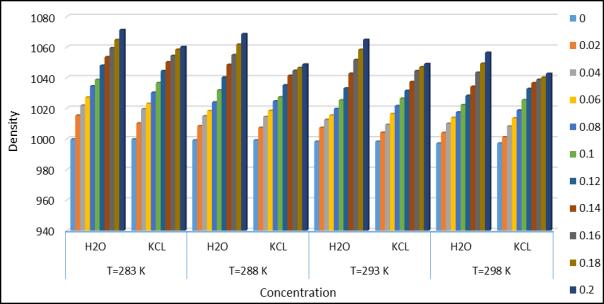 The experimental values of the velocity U and the density р at the temperatures283.15k, 288.15k, 293.15k and 298.15k areshownintable1.Calculatedthevalueofacousticimpedance(Z),adiabaticcompressibility(β),relaxationforce(r),surface tension(σ),relative relationship(Ra),solvation index, Wada’s constant(W), Rao’s constant(R),the isothermal compressibility(KT),thenonlinearparameters(B/A)isshownintable1-4.Thevariabilityofalltheseparameterswiththe concentrationof distilled waterandKCL withaminoaceticacidisshowninfig.1-10.Itisobserved thatthe densityofall the distilled water and aqueous KCL solution increase with the increase in concentration of solution as expected and decrease with increase of temperature due to the thermal energy of the system which distract the intermolecular force.[11]