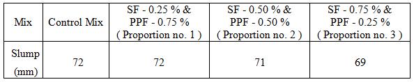 The workability of concrete is measured by slump test in accordance with IS 456 - 2000. Trials are carried out. The resultsshowthatastheSFandPPFindifferentproportions causesvariationinworkability.