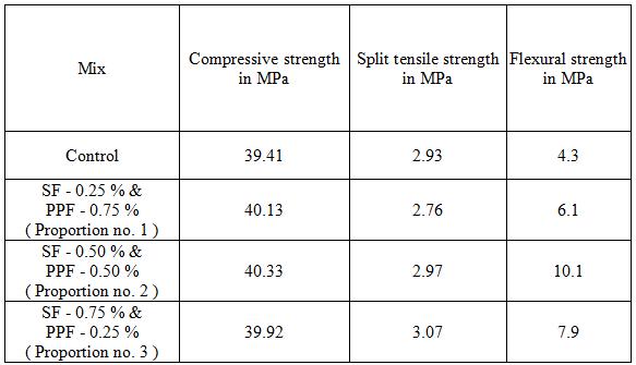 2. The experimental results had shown that the compressive strength, split tensile strength andflexuralstrengthofpolydisperse (SFand PPFindifferentproportions)concreteincreases inallproportions(exceptsplittensilestrengthof proportionno.1)thanthecontrolmix.
