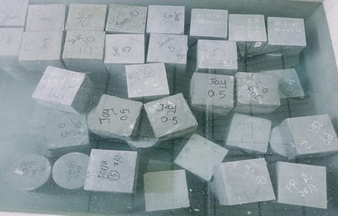 After 24 hours fromcasting,the specimens were removed fromthemould,checkandconfirmtheidentificationmarks for each type and immediately submerged in clean fresh wateri.e,watercuredfor28daysinawatertank.Thewater usedforcuringwassimilarwiththatusedforcasting.After 28 days, specimens were taken out and kept ready for testing. Fig 6 shows the image of specimens immersed in curingtank.