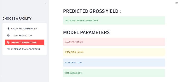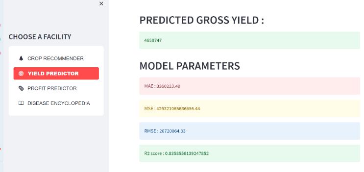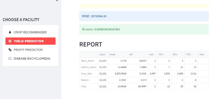 We take into account the following factors when computing the output of the yield predictor and the profit predictor: State_Name, District_Name, Crop_Year, Season, Crop, Area, Production, UnitPrice, Netprice, Unit Investment,NetInvestment,Profit,andwegettheresults.