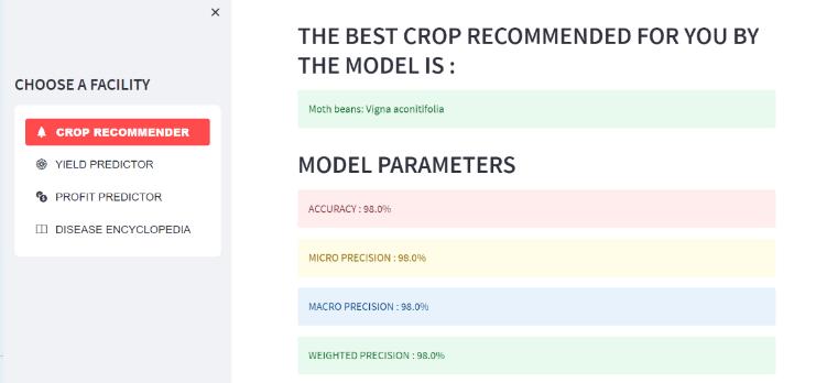 N (nitrogen value), P (phosphorus value), K (potassium value),temperature, humidity,PH, rainfall,and we get the accuracy, Micro Precision, Macro precision and weighted precision.