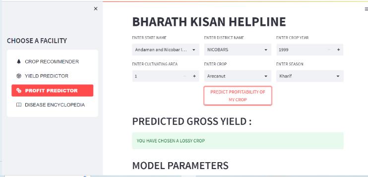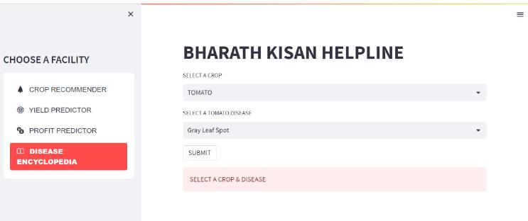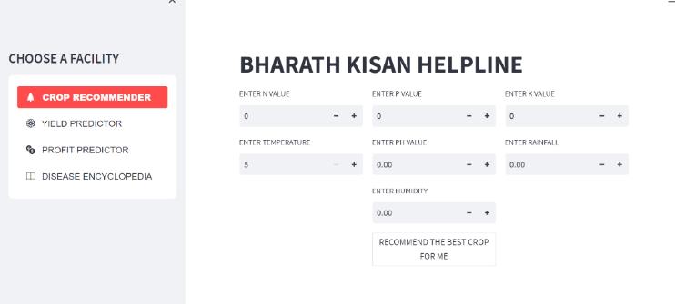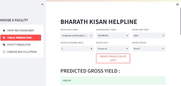 By uploading the data to the Bharath Kisan Helpline, the findings are dependent on the four parameters Crop recommendation, Yield predictor, Profit predictor, and Disease encyclopaedia. And when compared to other applications,ourapplicationhasachievedexcellentresults intermsofaccuracy,precision,anddiseasedetection.