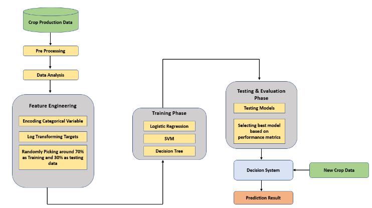 Information gathering and preparation are two key steps inensuringtheaccuracyofthedataset.Thereshouldbeno missing attributes in the dataset, and they should be replaced with the correct qualities. Additionally, the information needs to be examined to see if its characteristics follow a usual dispersion. Information investigation and representation are the preceding stage. Wemakeanefforttothoroughlystudyourdatainorderto spot any trends or standout instances in the dataset. We createdseveralrepresentationsofthematerialinorderto fully understand it. The following stage is highlight choosing; we must select only those components that will be expected to allow the type of product to grow. We createdacorrelationmatrixtoshowthelinearrelationship between one feature and each of the other features. Then comes data testing and instruction. Before we can start building the machine learning model, we must partition our dataset into training and test sets. The material was shared in a 70-30 split. Machine learning algorithms will be used for training, and performance matrices will be used to pick the model for testing. We are receiving the results, and the decision-making system will be able to extrapolatenewcropyielddataforcropyieldforecasts.To displaythe linear link amongone characteristic and every single one of the other features, we have constructed a correlation matrix. Testing the data will come next, then instruction. We must divide our information into training and test sets before creating the machine learning model. Thedistributionofthesubstanceis70to30.Performance matriceswillbeusedtochoosethemodelfortestingafter machine learning methods have been employed for training. We are receiving the results, and the decisionmaking For agricultural yield estimates, the methodology willbeabletoextrapolatefreshcropyielddata.