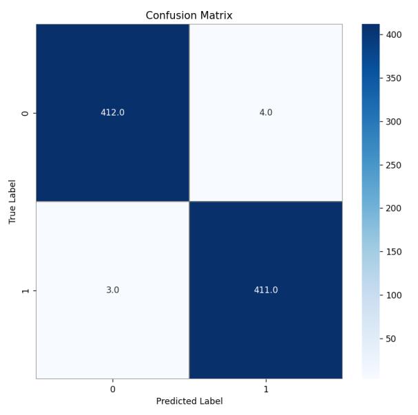 The model correctly identified normal eye 412 times (TruePositive)andglaucoma411times(TrueNegative),but incorrectly predictednormal eye4timesasglaucomaeye (False Positive) and glaucoma eye as normal eye 3 times (FalseNegative).