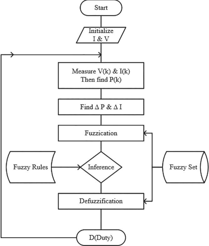 In FLC-MPPT, the input variables are typically the solar irradiance and the temperature, which are fuzzified into linguistic terms such as "low," "medium," and "high. The output variable is the duty cycle of the DC-DC converter, which is adjusted to maintain the optimal operating point. Fuzzy rules that govern the system behavior are derived from the expert knowledge of the system and are encoded as if-then rules. These rules map theinputlinguistictermstooutputlinguisticterms,which are then defuzzified to obtain the duty cycle of the DC-DC converter.