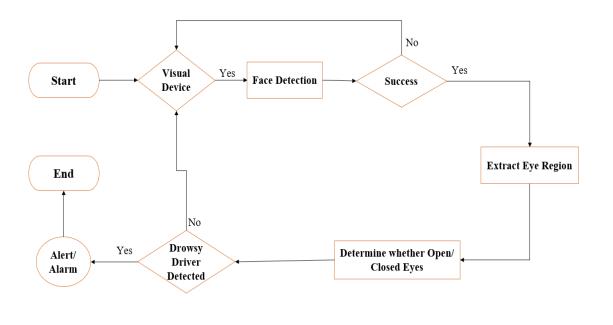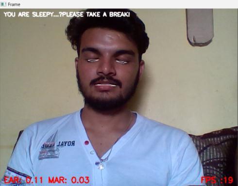 In this project, the input video is captured by using a camera and then it will be extracted. The face and eye detection are done by using OpenCV with the help of 68face landmarks. By using the Euclidean eye aspect ratio, we can get the eye blinking ratio, which helps to detect whethertheeyesareopenorclosed.Iftheeyesandmouth ratioislessthan0.21andgreaterthan0.35respectively,it will detect that the driver feels sleepy. If the eyes are closed more than a given time interval it will warn the driver by playing the alarm or if eyes are open it will display the message “eyes open” and then it will go to takingthevideoofthedriverandtheprocesswillgoon