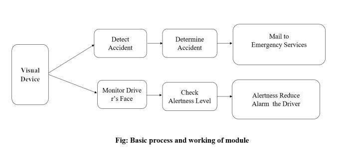 ambulance, hospital, police, and vehicle owner contact. The biggest disadvantage of the system is any component failstodetectlocationduetotechnicalissuesthatareone of the projects.[4] So in further study, The goal of this work was to provide an analysis of accelerated weights and the adjustment coefficient parameter to increase the accuracy ofclassification of the MRBM training algorithm. they followed over-fitting and under-fitting issues, and modified RBM was used instead of conventional RBM. Multiple types of accidents have been identified in a varietyofvehicles.[5]Theauthorhasusedtechnologylike Python, JUPYTER Lab, Image Processing, and Machine Learning.Inthisproject,theeyecounterissetto„20.The eye is detected as the eye is not blinking or not in a set countered number then shows a driver is drowsy in his vehicle dashboard. Mohsen Poursadeghigan, et. al. [6] drivingsimulatorbuiltonavirtualrealitylabattheKhajeNasir Toosi University of Technology was used to analyse fivesuburban drivers.The Villa-Jonesalgorithm wasused to identify the facial expressions and eye locations. Eye trackingcriteriafordetectingdrivers'levelsofdrowsiness included eye blink duration and frequency as well as PERCLOS, which was used to validate the findings. Levels of tiredness in drivers are directly correlated with blink frequency and length. Data entered into the network for testinganddataenteredintothenetworkfortraininghad mean squared errors of 0.0623 and 0.0700, respectively. Inthemeantime,thedetectionsystem'saccuracyratewas 93percent.Weobservedthatcurrently,manysystemsare using IoT devices which consist of RADAR and LIDAR systems, in this system the distance between vehicles is a problem, if the distance between vehicles increases, the system fails to do its work. In a few papers where an IoT systemusesvibrationtodetectanaccidentifthemachine breaks during an accident, a normal vehicle crash can resultinanaccidentoccurredresponse.Thesystemisnot abletodeterminewhetheranaccidenthasoccurredornot with high accuracy. We propose the solution by adding a feature where neighbour cars will detect the accident to maintain accuracy. When an accident occurs on the road, the neighbour’s car or the passer-by car captures it and sends the coordinates to the emergency system using machine learning. Machine learning drastically increases the accuracy compared to existing methods. The system detects the sleepiness of the drivers and if the module detects that the driver is not alert, it wakes the driver up andaskshimtotakeabreaktomaintainahealthydriving state. In smart cars, there are cameras placed on the car body to monitor the road which gives ease to the fundamentalrequirementsoftheproposedsystem