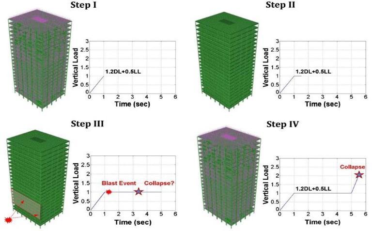 4. Further vertical load is added if the structure managestosurvivethebombscenarioofstep3,and it increases until the program does not display a warning of structural failure. The final load that causes collapse is calculated as 1.2DL+0.5LL from step1plusanadditionalverticalloadfromstep4.