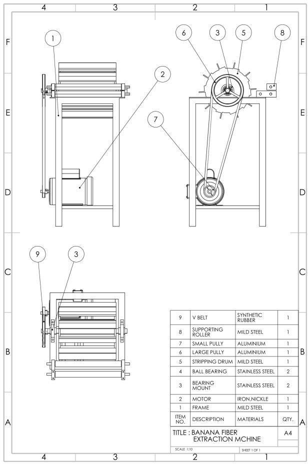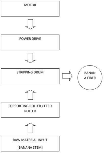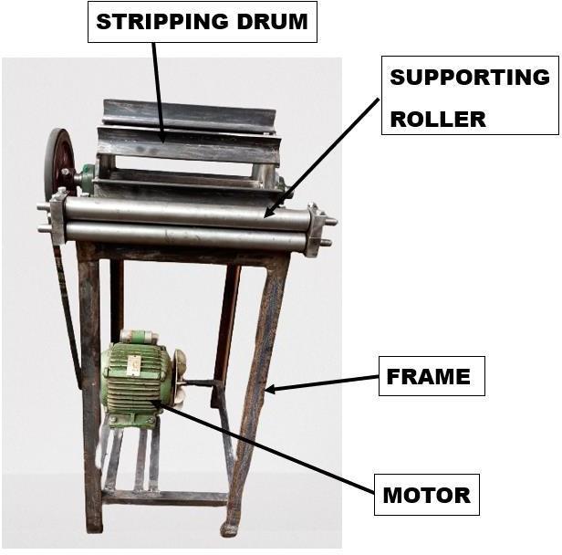 Thismachineconsistsofa1.5HPmotorwhichisconnectedto asmallpulley.Thestrippingdrumisfixedwithtwobearings inboththeendandonesideoftheshaftisconnectedtoa large pulley. Now both the pullies are connected to each otherusingaBtypeV-belt.ItalsoconsistsofGuidingroller throughwhichthebananastemisinsertedandreachesthe strippingdruminaninclinedposition.Duetotheinclination oftheslotthepulpgeneratedfallsapartfromthefiber.