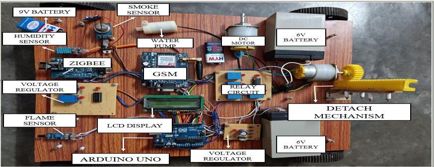 TheproposedapproachisbasedonGSMcommunications. The hardware setup has shown in Fig. 3 and 4. The kit is given a power supply by two separate 6-volt batteries. A voltageregulatorICisusedtoregulatethe12Vto5Vsupply totheArduinomicrocontroller. WhenunitispoweredON, theDCmotorkeepstheTrainunitmovingforward.TwoDC motor is used for the forward mechanism. Three channel relayisusedfortheforwardmechanism,waterpumpand fire extinguisher ball. When the sensor detects the flame, smoke,temperatureandhumidityabnormally,itwillsend SMSautomaticallytoLocoPilotbyGSMcommunication.It makes the fire extinguisher ball open from the box and it extinguishes the fire. The water pump is also used for extinguishingthefire.