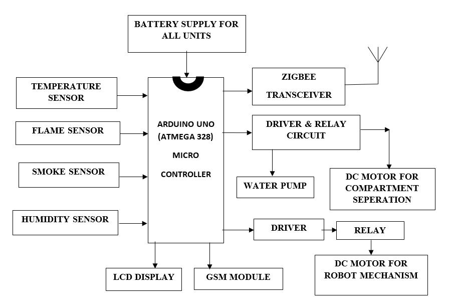 Figure 1 and 2 represents the block diagram of the transmitter node and receiver node respectively. Here ATMEGA Arduino UNO is used as a microcontroller. Four sensors namely temperature, flame, smoke, and humidity sensorused.Itwilldetecttheconditionsandupdatethemto the microcontroller. There will be some mechanisms like watercompartmentseparation.Usinga12VDCmotorthe othercompartmentwillbeseparated.Thesprinklersystem willbeturnedONusingthe12vDCwaterpump.Thesetwo mechanisms were controlled by using the relay driver circuits.TheLCDwillbeinterfacedwiththemicrocontroller. Itisusedtodisplaythevaluesreceivedbythesensors.There will be a separate DC motor for controlling the forwardmoving mechanisms. The Zig bee module has both the transmitterandreceiverinit.Everycompartmenthasthis moduletotransferthemessageandbuildcommunication.
