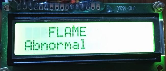 Theflamesensor isa short, thinmetallicrodthat createsasmallcurrentofelectricitytoconfirmthepresence ofaflameburningwithinthefurnace.Figure11showsthe output of LCD displays 'FLAME ABNORMAL'. When the Flamesensorshowsthevalue'0',itisnormalandwhenitis '1', it shows it is abnormal. Figure 11 shows the flame abnormal.