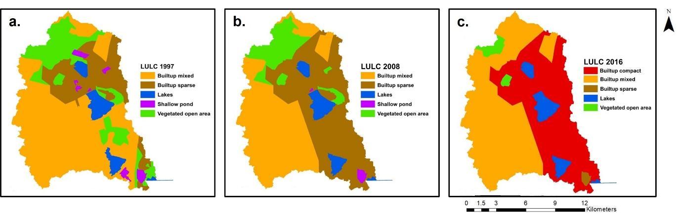 LULCclassification:FortheLULCclassificationofthestudy areaIndianSpaceResearch'Organization’sNaturalresource censusLULCclassificationschemawasreferenced.Thestudy area was classified into six categories; built-up-compact, built-up-mixed,built-up-sparse,vegetatedopenarea,lakes, andshallowponds.