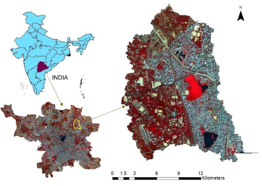 The current study area lies between 17°27'28.805"N, 78°30'56.782"E and 17°29'45.006"N, 78°32'37.005"E. It includes sections of the Cantonment area and Malkajgiri circleofGreaterHyderabadMunicipalCorporation(GHMC). ItisthemainresidentialneighborhoodinGHMC'sMalkajgiri circle.Neredmet,RamakrishnaPuram,andSafilgudaaresome oftheresidentialareas.Thestudyareaincludeswatersheds of two large lakes, Ramakrishnapuram and Safilguda. This regioncoversanareaof772.34hectaresintotal.Allofthe