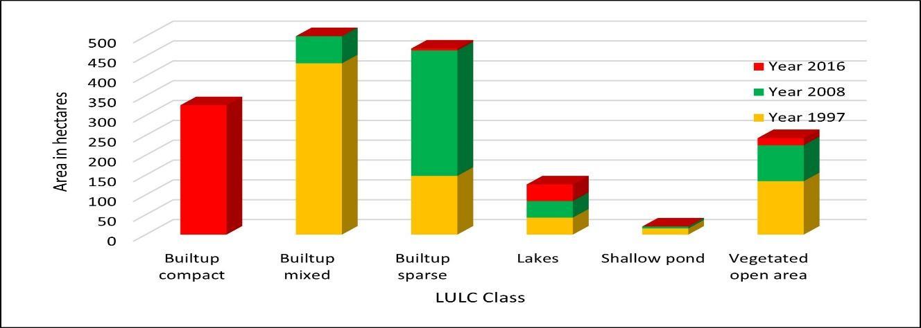 The present study's LULC change analysis reveals a significantdecreaseinvegetatedareas.Ithasdecreasedin size from 134.59 ha in 1997 to 17.95 ha in 2016. Nonperennialwaterbodies,whichoriginallyaccountedfor15.20 hain1997,werealsoencroacheduponfordevelopment.The results show that the number of residential communities createdin1997waslower,withgreatergreenspace.Builtup has gradually expanded due to the migration of residents fromnearbytownsandruralregions.Thepresentresearch area comprises cantonment areas that are occupied by militaryestablishmentsanddefenseresidencesandarenot eligibleforcivilianresidentialdevelopment.Asaresult,this region features a mixed built-up kind of land use, with buildings surrounded by large trees and lush vegetation coveringaround60%ofthearea.