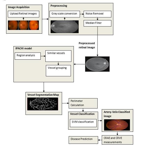 The retina is composed of layers of interconnected neurons with synapses and contains blood vessels that mayexhibitabnormalitiesandalterationsatanearlystage. These abnormalities are often expressed through the arteriolar-to-venular diameter ratio, which is associated withhigherbloodpressurelevels.Todevelopandtestour proposed method, we constructed an image dataset using publicly available datasets like DRIVE and STAR. Each imageinthedatasetwascapturedata resolutionof760x 570 pixels with 24 bits per pixel. Initially, the proposed method was tested on normal images, which are easier to differentiate, and further testing is needed to establish its effectiveness in identifying abnormal vessel appearances. Abnormal images typically contain multiple artifacts of varying shapes and colors caused by different diseases, in addition to the blood vessels, optic disc, fovea, and background.