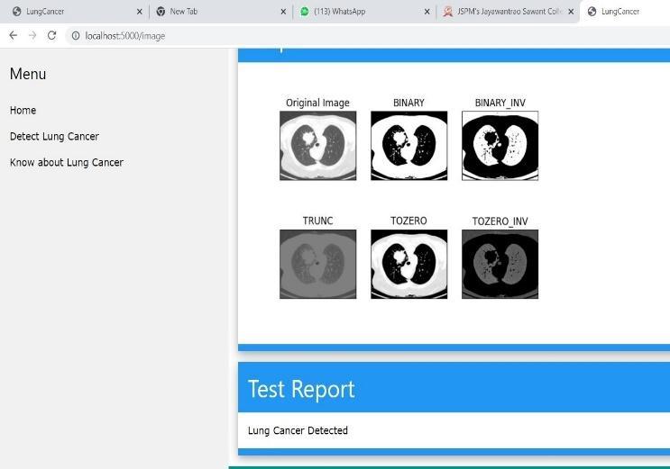 Application of median Filter to eliminate impulse noise in the images proved to be a success. The morphological operationsalsocontributedtowardssatisfactoryresultsin the process of segmentation. Artificial neural networks proved to be a good classifier with acceptable accuracy. The methodology adopted in this project resulted in an accuracy of 92% for the hospital database. This system aims at increasing the accuracy and speed of the lung cancer detection system. It also helps in detecting the canceratearlierstages.