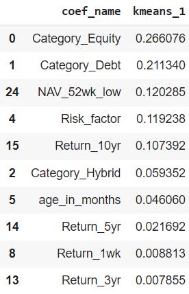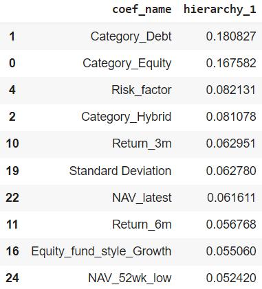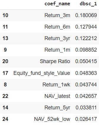 Fig. 5 shows that the most effective feature while using agglomerative clustering is âEquity_fund_style_Growthâ followed by âStandard_Deviationâ and âCategory_Equityâ. Likewise, Fig. 6, Fig. 7 and Fig. 8 show the most effective featuresintheHierarchical,K-meansandDBSCANmethods respectively.ItisclearfromtheobservationsthatâCategoryâ columns play a major role in almost all the clustering algorithmstodividethemutualfundsintoclusters.