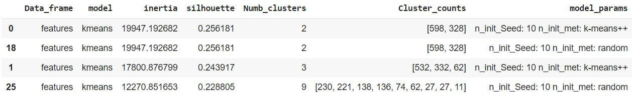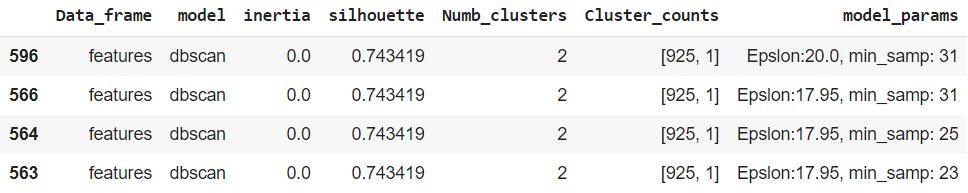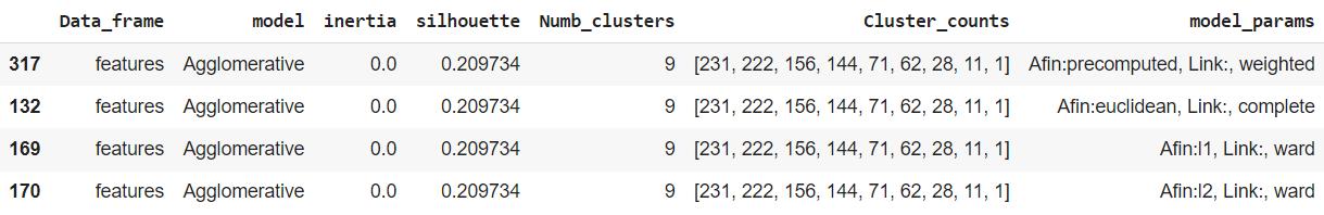 For each combination of model and hyperparameters, clusteringhasbeenperformedandtheresultsarerecorded. We compare these models on the basis of the silhouette score. Fig.1showsthetopK-meanssilhouettescoreswith maximumscoreof0.256forming2clustershavingcountsof 598and328. SimilarlyFig.2,Fig.3andFig.4showsthetop scores for Hierarchical, Agglomerative and DBSCAN clustering models respectively along with their cluster counts.