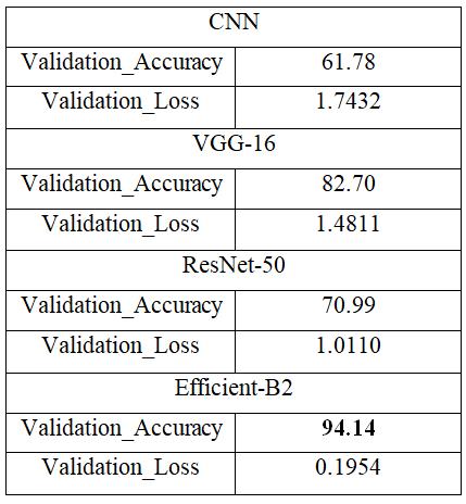 Asevidentfromtheclassificationtablepresentedearlier,it can be concluded that Efficient-B2 algorithm achieves the highest accuracy of 94 percent as compared to other algorithms that were tested. The table also provides information on the validation accuracy and loss error obtained from different algorithms. Additionally, the precisionvaluesgiveninthetableareusedtodeterminethe finalaccuracyofthemodel.