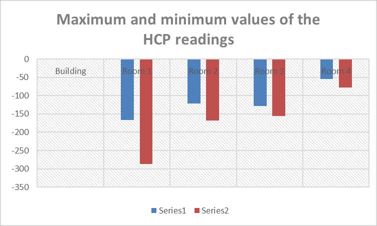 Basedonthegivendata,itappearsthatallfourroomshavea maximum HCP value of 6 mV, which indicates a low probability of corrosion activity. However, the minimum HCPvaluesforeachroomvary,withRoom1havingthemost negativeHCPvalueof-287mV,followedbyRoom2with168mV,Room3with-155mV,andRoom4with-78mV.