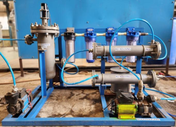 Initiallytochecktheleakagesincomponentsfittings,water was passedthroughthecomponents,and it alsohelped to clean the internals of the housings and filter. Once the cleaning and leak test was done cartridge filters, Carbon filters and seawater RO membrane were installed in the housings.Actualtestrunwasstartedbystartingthepumps whichpumpedthedirtysalinewaterwithhighTDSlevel.