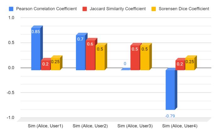 Infig.8,thex-axisshowstheusers,whilethey-axisshows3 the similarity score. Three different similarity metrics are used to calculate the similarity between Alice and other users. The bar chart shows that user 1 has the highest similarity score using the Pearson Correlation coefficient. Whereas, User 2 has the highest similarity score using Jaccard Similarity Coefficient. User 3 and user 4 have low similarity scores with Alice using Pearson Correlation CoefficientbuthaveaveragesimilarityscoresusingJaccard SimilarityCoefficientandSorensenDiceCoefficient.