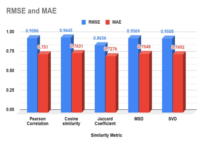 ThehighestvaluesforbothRMSEandMAEareobservedfor CosineSimilarity,followedbyPearsonCorrelationandMSD. ThelowestvaluesforbothmetricsareobservedforJaccard CoefficientandSVD.Hence, themetricswithhigherRMSE and MAE values indicate a larger prediction error, while lowervaluesindicatebetteraccuracy.