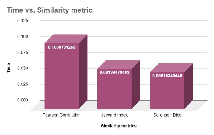 Fig.10 displays a bar chart where the x-axis shows the similarity metrics, and the y-axis shows time. The chart indicates that the Jaccard Similarity Coefficient takes less timethanthePearsonCorrelationCoefficient.