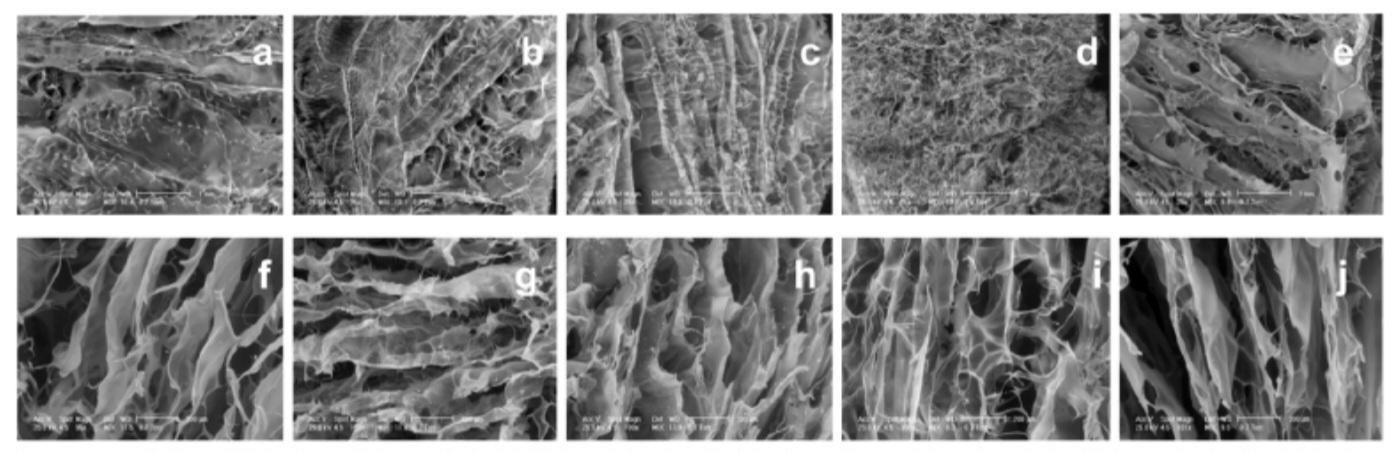 Skinhasthesamenon-homogeneityinporesizeasthecompositematerials[26].Microporesimprovethemechanicsof thescaffoldandprovidetargetedcellmigrationduringtissueregenerationanddefectcorrection,whereasmacroporesinthis complextissueoftenserveasspacesfortissuedevelopmentandvascularization[27].Contrarily,thelyophilizationprocedure andvacuumexposureoftheupperhalf,whilethelowerpartwasindirectcontactwiththeplasticmould,wereresponsiblefor thediscrepanciesinsurfaceandinsideporemorphology[28].