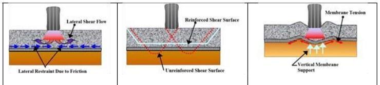 Fig.2(b)showstheimprovedbearingcapacityconcept.The third fundamental reinforcement mechanism has been termed the “tensioned membrane effect.” The tensioned membraneeffectisbasedupontheconceptofanimproved verticalstressdistributionresultingfromtensilestressina deformed membrane. Fig.2 (c) illustrates the tensioned membraneeffect.