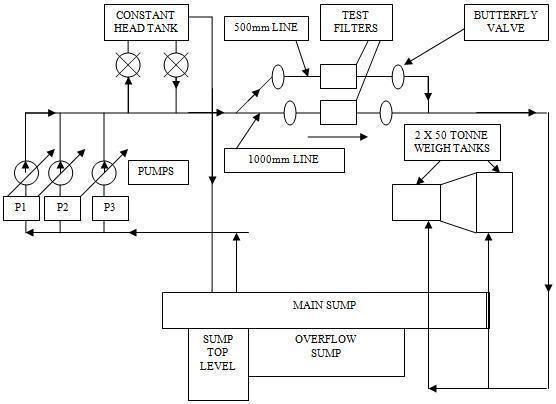 The test circuit at CWPRS, where the filter was put through its paces, complies with ISO: 4185 and provided an800m3capacitysumpthatservedasasourceofwater for three parallel, variable-speed DC motor-driven pumps (700 LPS, 30 mwc), which feed water at a constant flow rate either into the Constant Head Tank (CHT) or directly into the flow metre line. Two 1000mm-sized throttling valves are offered for series operation, providing a fine control for controlling the flow rate through the test element. Pumps with variable speeds and a throttle valve on the bypass line that connects the pump delivery manifold and suction manifold are additional controls for adjustingflowrate.