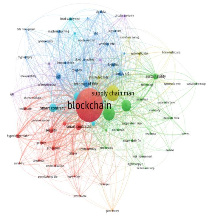 Therefore,thispapertriestodisclosethedevelopmenttrend ofblockchaintechnologyanditsapplicationinsupplychain management by employing a bibliometric analysis. The complicatedinteractionsofobjectiveitemscouldbedepicted and reflected through the similarity definition realized by theVosViewermappingtechnology.VosViewerenablesusto explorethestructureandcharacteristicsoftheresearchfield or a set of publications through bibliometric maps, which showrelationshipsbetweenauthors,institutions,keywords, and other bibliographic elements. VOSviewer allows us to create maps based on co-citation analysis, co-authorship analysis,andkeywordanalysis,amongothers.Thepurpose of the VosViewer technology is to reflect the similarity