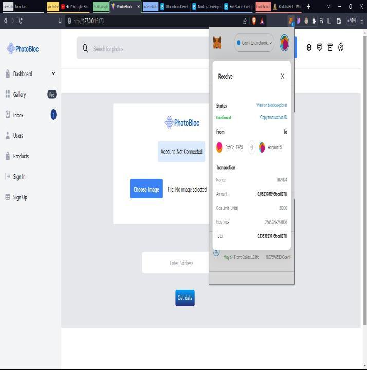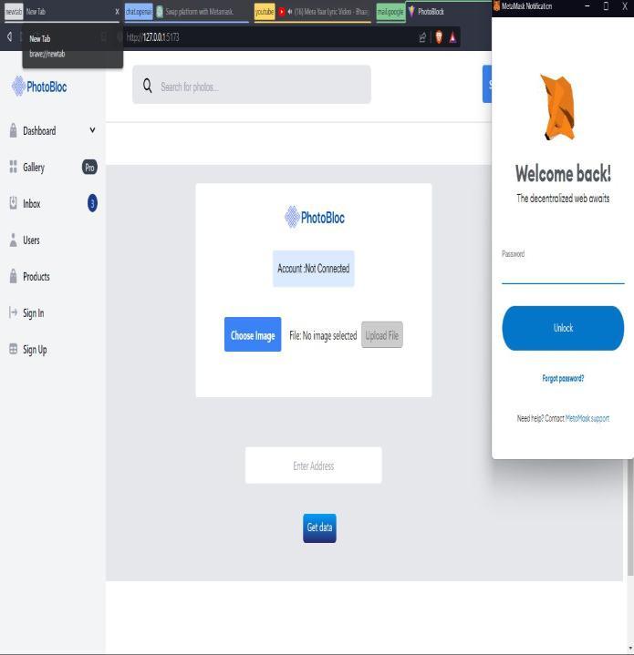 The blockchain image storage and retrieval process was madeeasierbythePhotoStoragecontract.Itmadeuseofthe decentralized,immutableIPFS(InterplanetaryFileSystem) tostoretherealimagefiles.Eachimage'sIPFShashaswellas metadataliketheuploader'saddressandtimestampswere includedinthecontract.Bysubmittingtheirphotographsand retrieving them inaccordance withtheirownership, users might engage with the contract. The decentralized photo storagefeaturewassupportedbythePhotoStoragecontract. Itmadeiteasiertosaveandgetphotosfromtheblockchain. Thecontractmadeuseofthedecentralized,distributedfile storage technology known as IPFS to do this. A user's