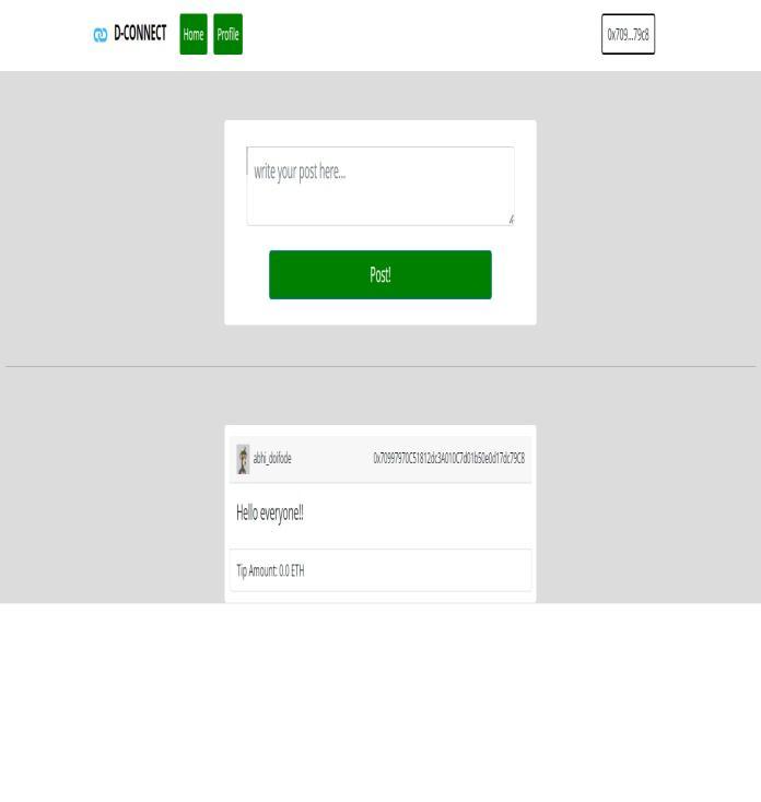 Thisguaranteedthedecentralizedandunchangeablestorage of user-added postings, ensuring the data's security and transparency.OntheEthereumblockchain,theuserprofiles pictureswereaddedasNFTs(Non-FungibleTokens).Digital artandotheruniquedigitalgoodscanbekeptinNFTs,which are one-of-a-kind digital assets that are saved on the blockchain and cannot be duplicated. We made sure that profile images would be simple for users to access and retrievebystoringtheminNFTs.