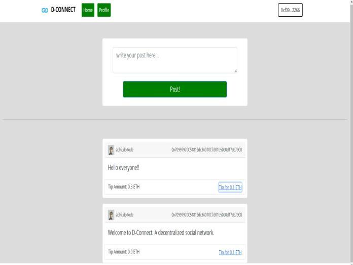 Thereareseveralstepsinvolvedintheimplementationofthe socialmediadAppsusingblockchain.First,weusedReactJS toconstructthedAppsuserinterface,andweintegratedthe MetaMask wallet to handle user authentication and transactionprocessing.Theuserdata,posts,andNFTswere thenstoredinsmartcontractsfortheEthereumblockchain. Solidity, a programming language for building smart contracts for the Ethereum blockchain, was used to write these smart contracts. We used IPFS (Interplanetary File System),adecentralizedfilestoragesystemthatenablesfiles to be saved and retrieved without a centralized server, to storethepostscontributedbytheusers.