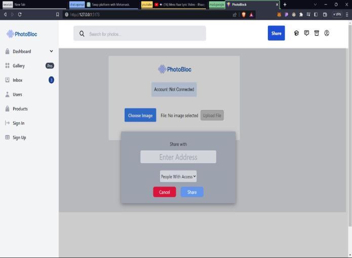 Images saved on the blockchain were accessible and shareableunderthecontroloftheAccessControlcontract.By sharing their public keys, users might grant other users access to their saved photos. The agreement preserved a relationshipbetweentheowner'saddressandtheaddresses ofuserswhoweregivenaccesstotheirimages.Thephotos could only be accessed by persons who also had the authorizedpublickeys.