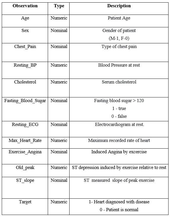 The Cleveland, Statalog, Hungarian, Swiss, and Long Beach VA heart datasets were pooled in this study to producealargerdatasetwithatotalof1190occurrences.11 commonfeaturesandatargetvariablewereincludedinthe merged dataset. Six nominal and five numerical variables wereincludedinthedataset,whichwasusedtoanalyseand forecast heart disease. The accuracy of machine learning modelsusedtoforecastcardiacdiseasemaybeenhancedby theuseoflargerdatasetswithdiversesamples.