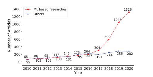 Paralleltothis,cloudandedgecomputing,aswellasother technologies,havehelpedmachinelearning(ML)techniques togainalotofpopularity.Awiderangeofapplicationsthat, like ITS services, demand a variety of requirements have incorporated machine learning (ML). For prediction and precise decision making[3-5] in addition to vehicular cybersecurity, ML technologies like deep learning and reinforcementlearninghavebeenparticularlyhelpfultools todiscoverpatternsandunderlyingstructuresinmassive datasets.[6]Thenumberofresearchinitiativesleveraging ML toenableandoptimizeITStaskshasclearlyincreased overthepast10years,accordingtostatisticsonscientific publications(seeFigure1).