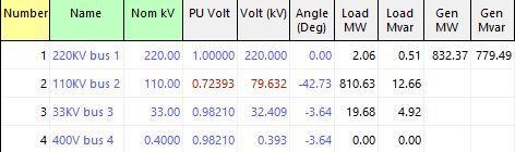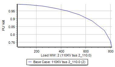 In this case the results of load flow analysis and voltage instabilitystudyofcircuit2showninfigure2isdiscussed. Figure 10 shows the results of Newton Raphson analysis using MATLAB of the four bus system given in figure 2. Figure11showslineflowsandlinelossesofcircuit2.Figure 12 shows the magnitudes and phase angles of the bus voltagesusingMATLAB.Figure13givestheresultsofpower flowanalysisusingPowerWorldsimulator.APVcurvewas plotted using PowerWorld simulator for 110kv bus (bus no.2) as shown in figure 14. The resulting changes in the systemcanbeseeninfigure15.Thekneepointofthecurve is achieved at a pu voltage of 0.72393 and at a maximum loadof810.63MW.Capacitorcompensationof224.8Mvaris thenprovidedbyconnectingcapacitorinshunttothe110kv bus(busno.2)andtheimprovedresultscanbeseeninfigure 16